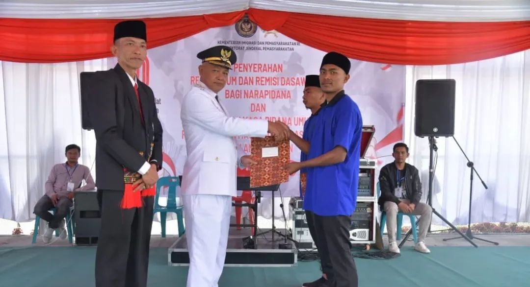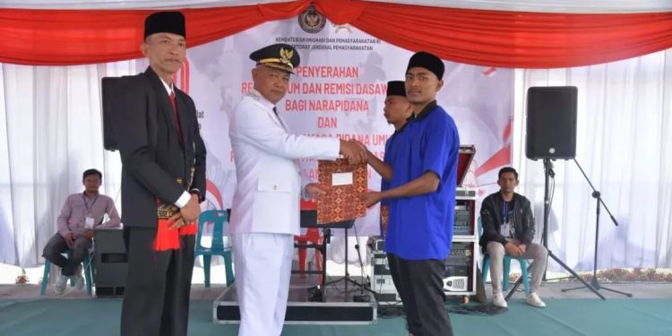 BENER MERIAH, GEMAPERS.COM – Wabup Bener Meriah Ir. H. Armia berikan remisi secara simbolis kepada Warga Binaan Rutan Kelas IIB Bener Meriah pada HUT RI Ke-80 Tahun 2025 yang berlangsung di Rumah Tahanan (Rutan) Kelas IIB Bener Meriah, Minggu (17-08-2025)