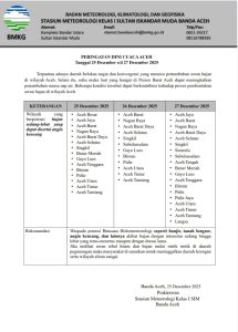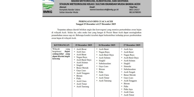 BANDA ACEH, GEMAPERS.COM – Badan Meteorologi, Klimatologi, dan Geofisika (BMKG) Stasiun Meteorologi Kelas I Sultan Iskandar Muda mengeluarkan peringatan dini cuaca ekstrem bagi wilayah Aceh, khususnya Kabupaten Bener Meriah. Kondisi ini dipicu oleh adanya belokan angin dan konvergensi yang mempercepat pertumbuhan awan hujan.