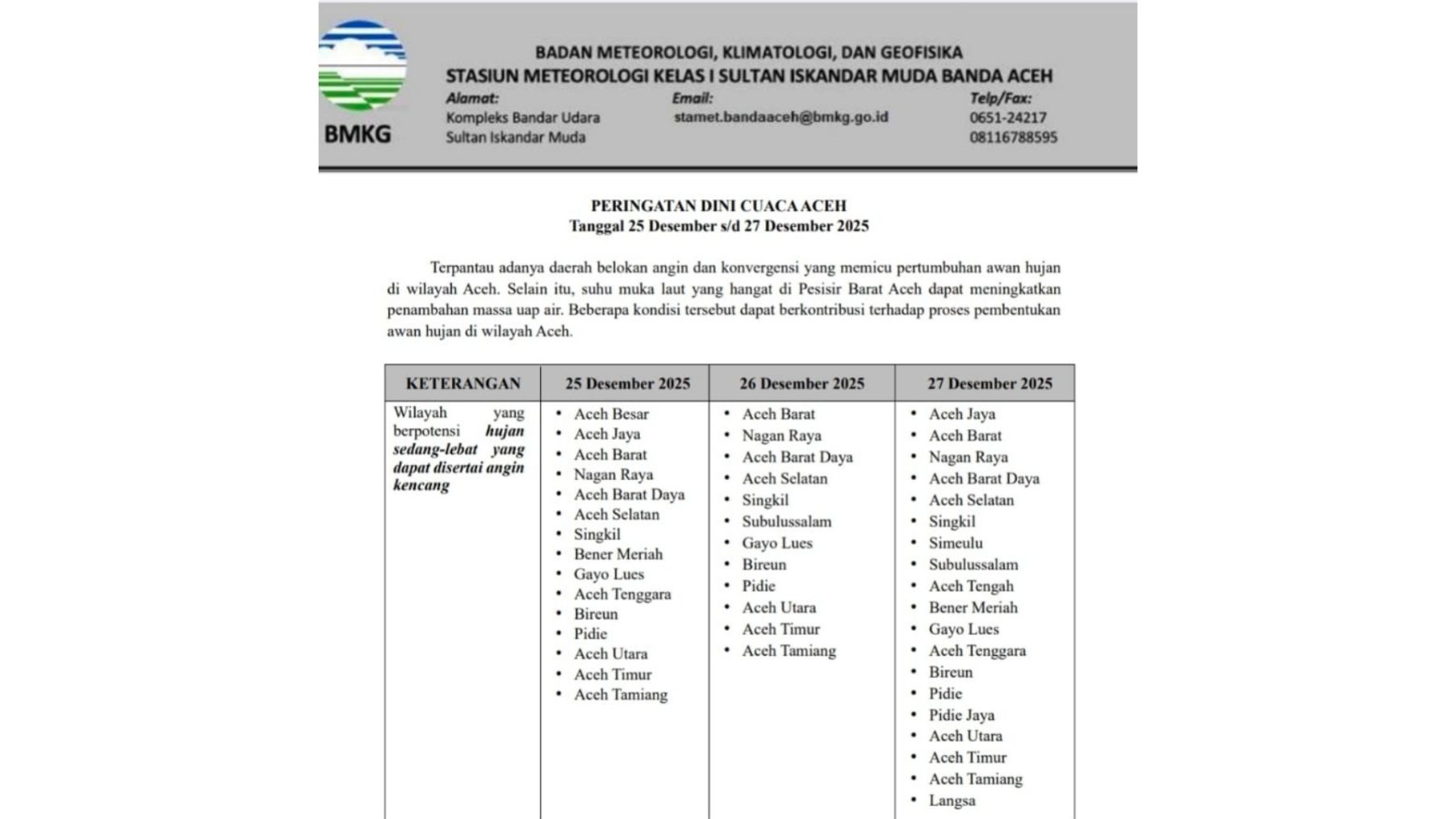 Potensi hujan intensitas sedang hingga lebat yang disertai angin kencang khusus di Bener Meriah diprediksi terjadi pada, Kamis, 25 Desember 2025, dab Sabtu, 27 Desember 2025.