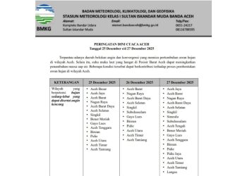BANDA ACEH, GEMAPERS.COM – Badan Meteorologi, Klimatologi, dan Geofisika (BMKG) Stasiun Meteorologi Kelas I Sultan Iskandar Muda mengeluarkan peringatan dini...