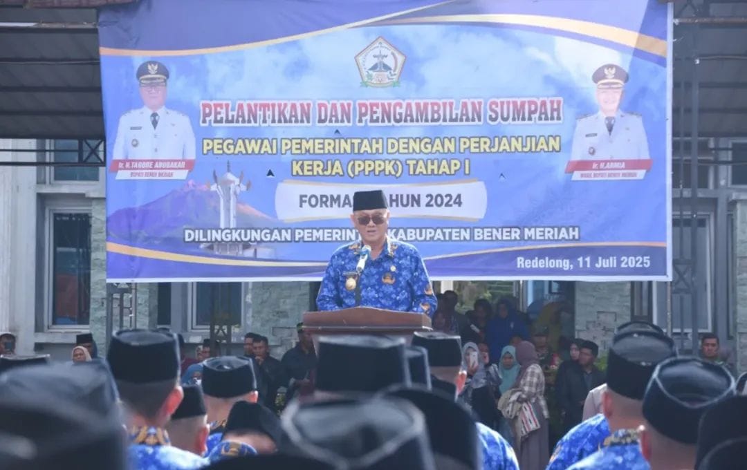 BENER MERIAH, GEMAPERS.COM – Bupati Bener Meriah Ir. H. Tagore Abubakar melantik dan mengambil sumpah 1.484 orang Pegawai Pemerintah dengan Perjanjian Kerja (PPPK) Tahap 1 Formasi Tahun 2024, Jumat (11-07-2025) di lapangan Setdakab Bener Meriah.